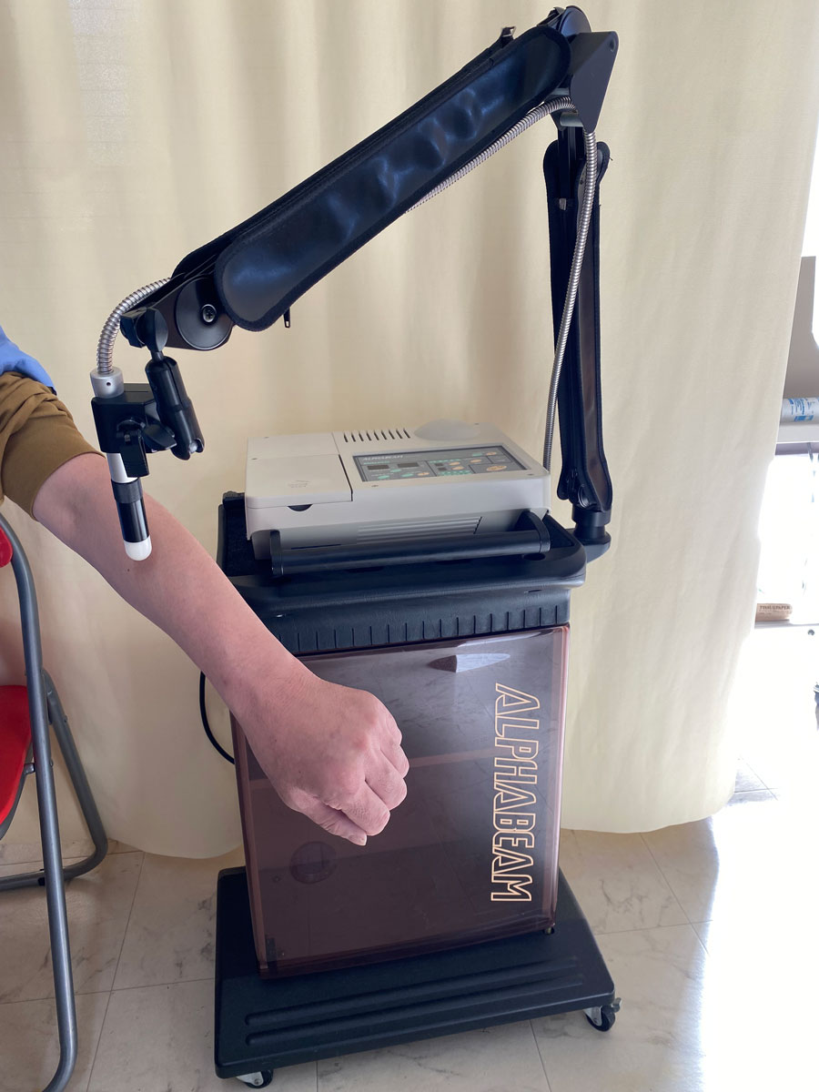 近赤外線の光が、体の深部まで浸透して、血流・血量を増大し、新陳代謝を促進します。筋肉や関節の炎症や痛みに使用します。